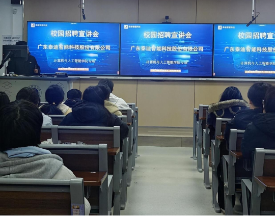 宣讲会上,广东泰迪智能科技股份有限公司校招负责人围绕企业发展理念、人工智能算法研发、云计算服务等核心业务板块展开详细介绍,同时展示了企业荣誉资质、办公环境与员工团建活动等内容。该负责人表示,企业高度重视产学研合作,希望通过宣讲让学生直观感受企业文化与发展愿景,为其提供多元化职业发展机会。宣讲尾声,企业公布本次校招岗位需求,感兴趣的学生现场提交简历,并依次参与笔试与面试环节。