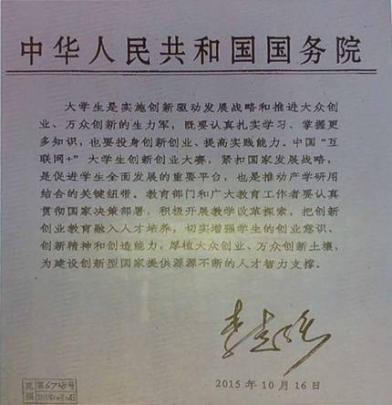 2015年3月5日,第十二届全国人民代表大会第三次会议在人民大会堂举行。李克强总理提出制定“互联网+”行动计划。4月10日,李克强总理视察吉林大学时,提出“大众创业、万众创新”口号,并对举办中国“互联网+”大学生创新创业大赛作出明确指示。为贯彻落实李克强总理的重要指示和《国务院办公厅关于深化高等学校创新创业教育改革的实施意见》,教育部决定举办首届中国“互联网+”大学生创新创业大赛。7月9日湖北省教育厅发布《关于举办首届中国“互联网+”大学生创新创业大赛湖北赛区省级复赛的通知》(鄂教高函〔2015〕23号),10月19-21日,全国总决赛于在吉林大学举行。中共中央政治局常委、国务院总理李克强对此次大赛作出了重要批示。批示指出:中国“互联网+”大学生创新创业大赛,紧扣国家发展战略,是促进学生全面发展的重要平台,也是推动产学研用结合的关键纽带。
